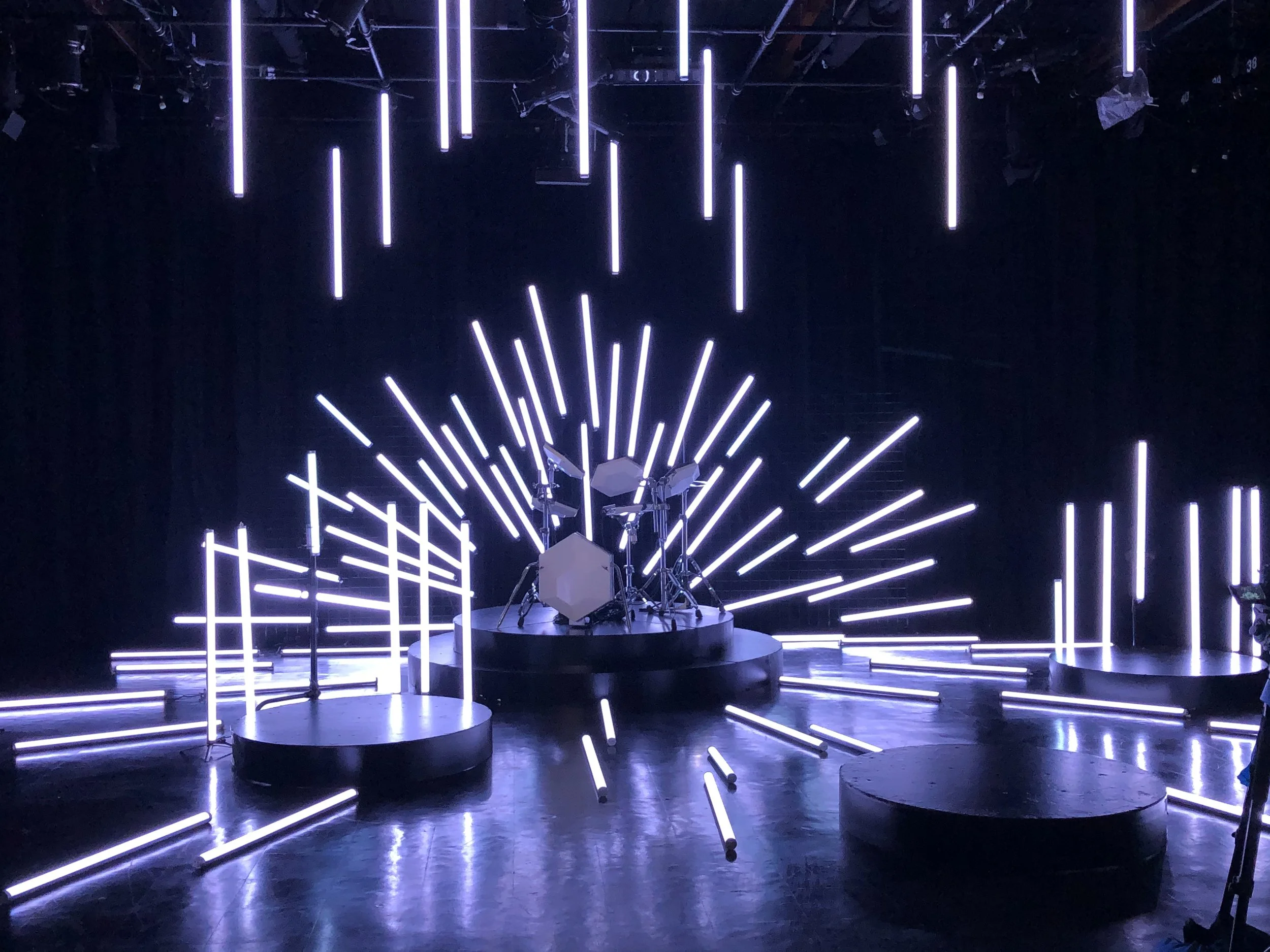 Securing the astera tubes invited thinking outside of the box! I did not want to clutter the space with light stands, plus needed something versatile enough to accommodate and the angles and heights of the design. A week prior to this job, I was shopping for retail sorry fixtures in a prop house. A black clothing store style metal frame came to mind. We attached a few panels together creating a back wall, which, once lit, became barely visible against the black walls of the studio. With a boat load of cable ties, each tube was secured to the grid. A smattering of lights were secured vertically from the lighting grid above the stage and some to mirror sat on stands around the circular steel deck staging, with a few tubes splayed out on the floor.
